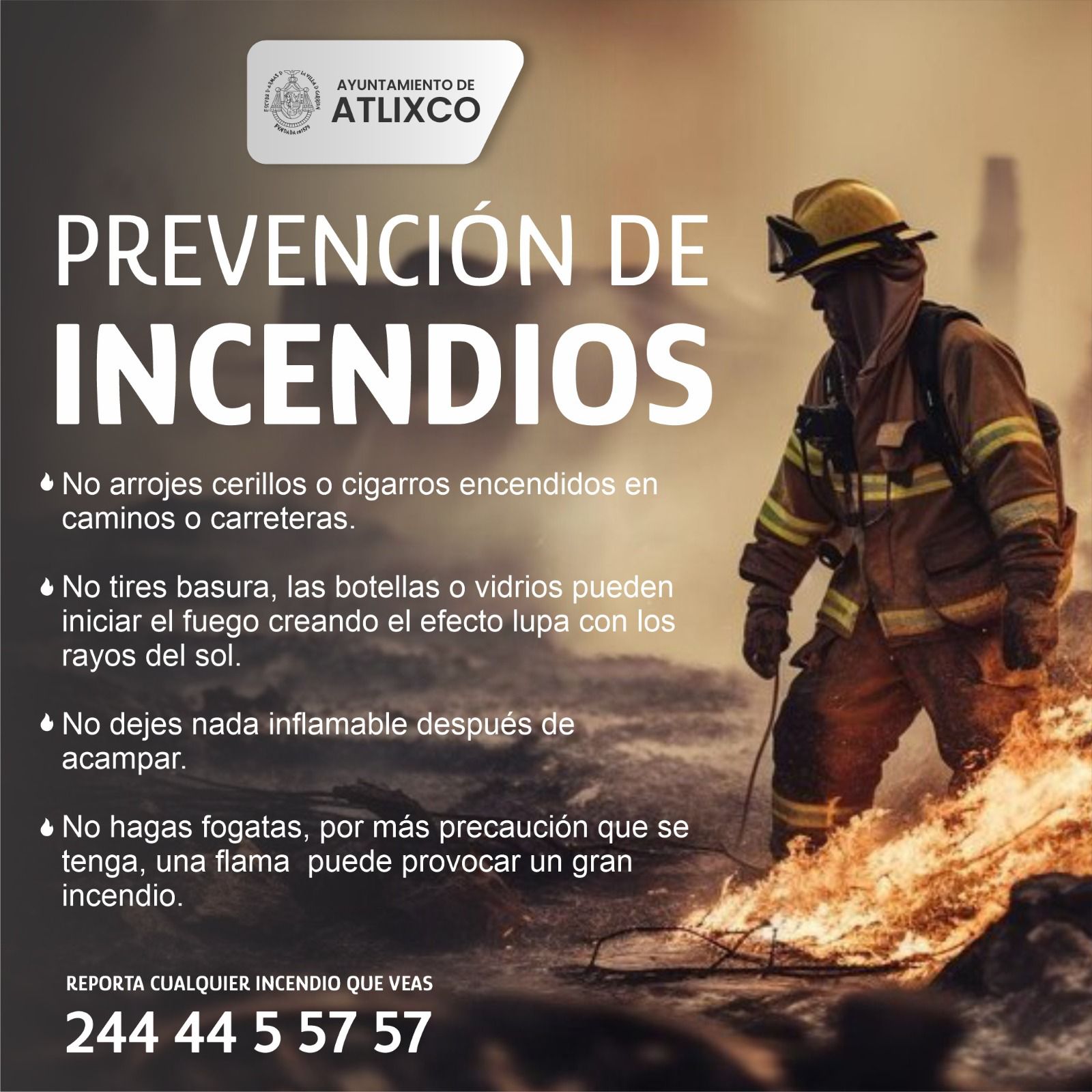 Dado que durante esta temporada los incendios forestales tienden a incrementar, la Coordinación de Protección Civil del municipio de Atlixco invita a tomar en cuenta las siguientes recomendaciones para prevenir quemas en zonas con maleza, además, hace un llamado a los propietarios de terrenos baldíos a mantener limpios sus predios.