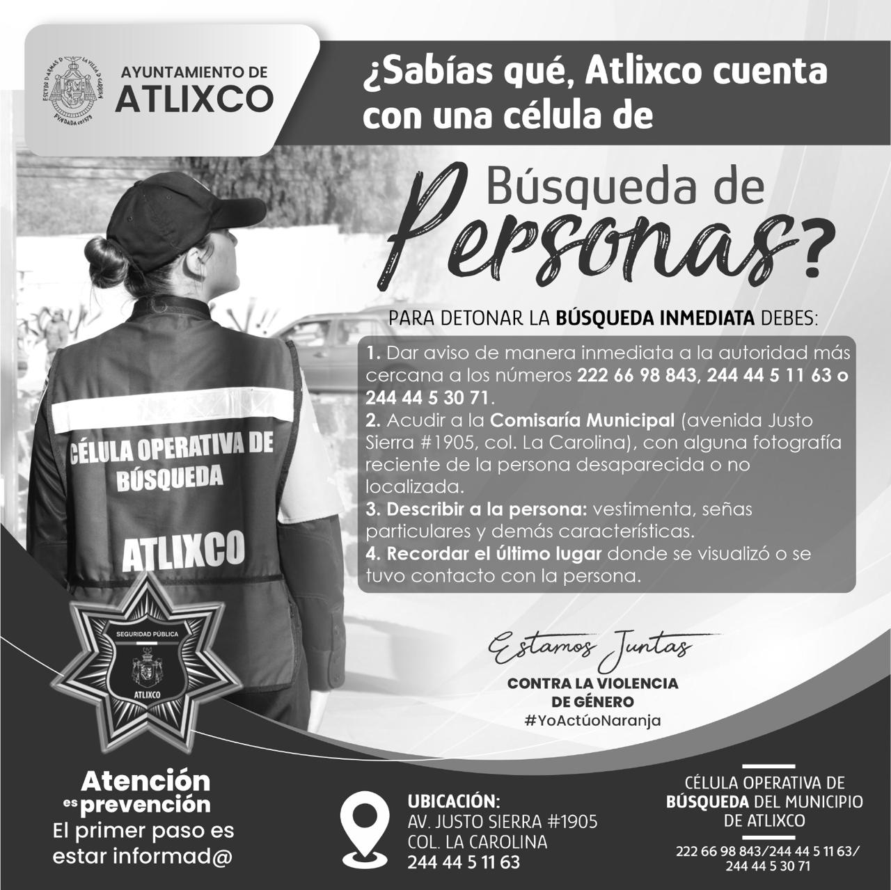 ¿Sabías que Atlixco cuenta con una Célula de Búsqueda de Personas?, integrada por elementos de seguridad pública que colaboran en la búsqueda y localización de personas reportadas como desaparecidas.