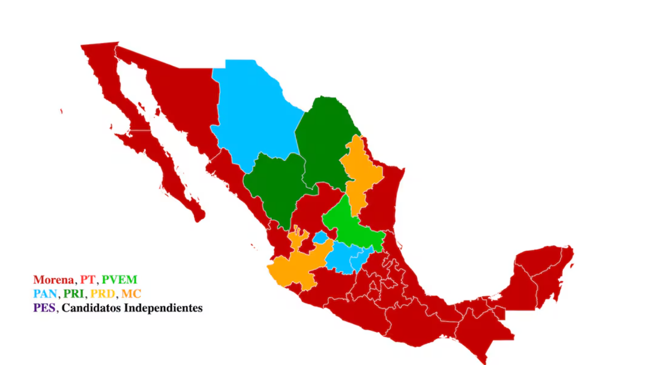 El movimiento que lidera el presidente Andrés Manuel López Obrador aumenta su poder en las 32 entidades federativas, al pasar de gobernar cuatro Estados en 2018 a 24 en los actuales comicios
