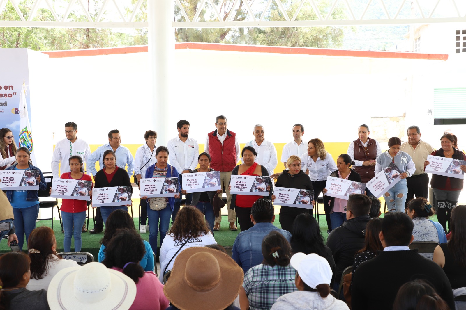 NICOLÁS BRAVO, Pue.- Como parte de las acciones que desarrolla el gobierno estatal para que el progreso comunitario sea una realidad, el gobernador Sergio Salomón inauguró el techado de la escuela Primaria “Unión y Progreso”, en la junta auxiliar de Azumbilla, además entregó 12 apoyos para el bienestar de las familias poblanas y 15 títulos de propiedad.