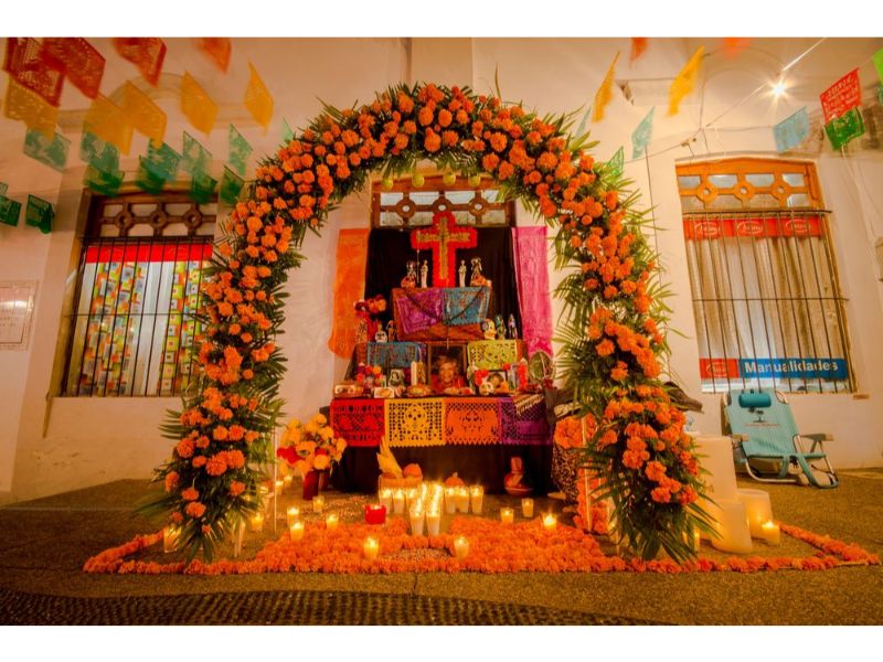 Séptimo nivel. La cruz de cal: la cruz de cal o pétalos de cempasúchil representan la resurrección y la conexión entre la tierra y el cielo.