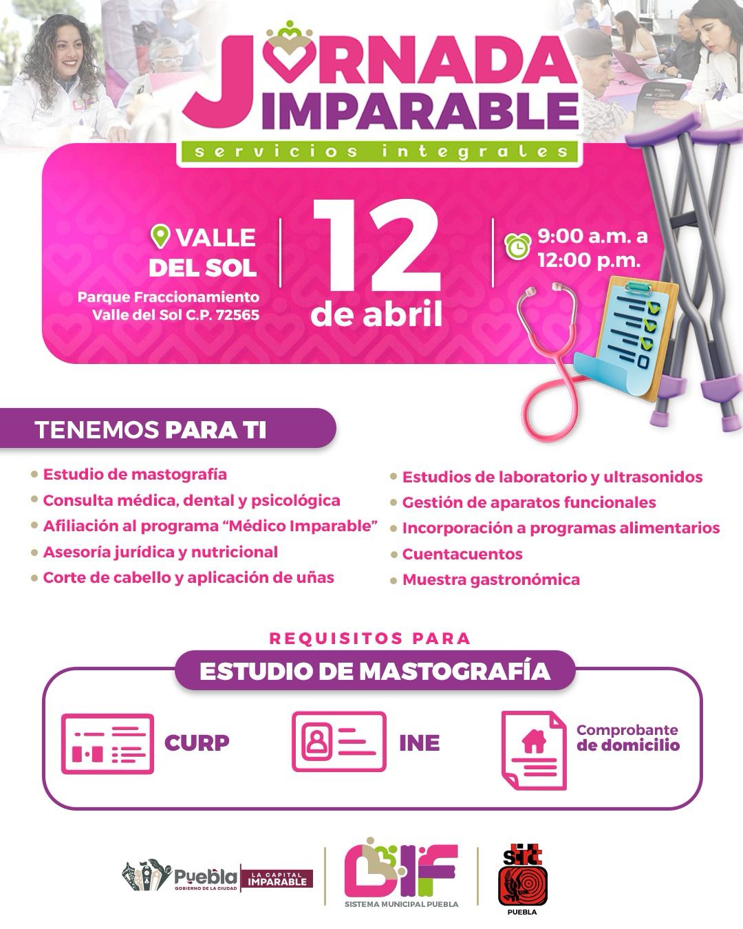 Puebla, Pue. – Siguiendo la línea de acción del Gobierno de la Ciudad por acercar a las colonias y juntas auxiliares los servicios que ofrece el Sistema Municipal DIF, el próximo 12 de abril se llevará a cabo la Jornada Imparable de Servicios Integrales en el parque de la colonia Valle del Sol, en la Junta Auxiliar Ignacio Zaragoza.