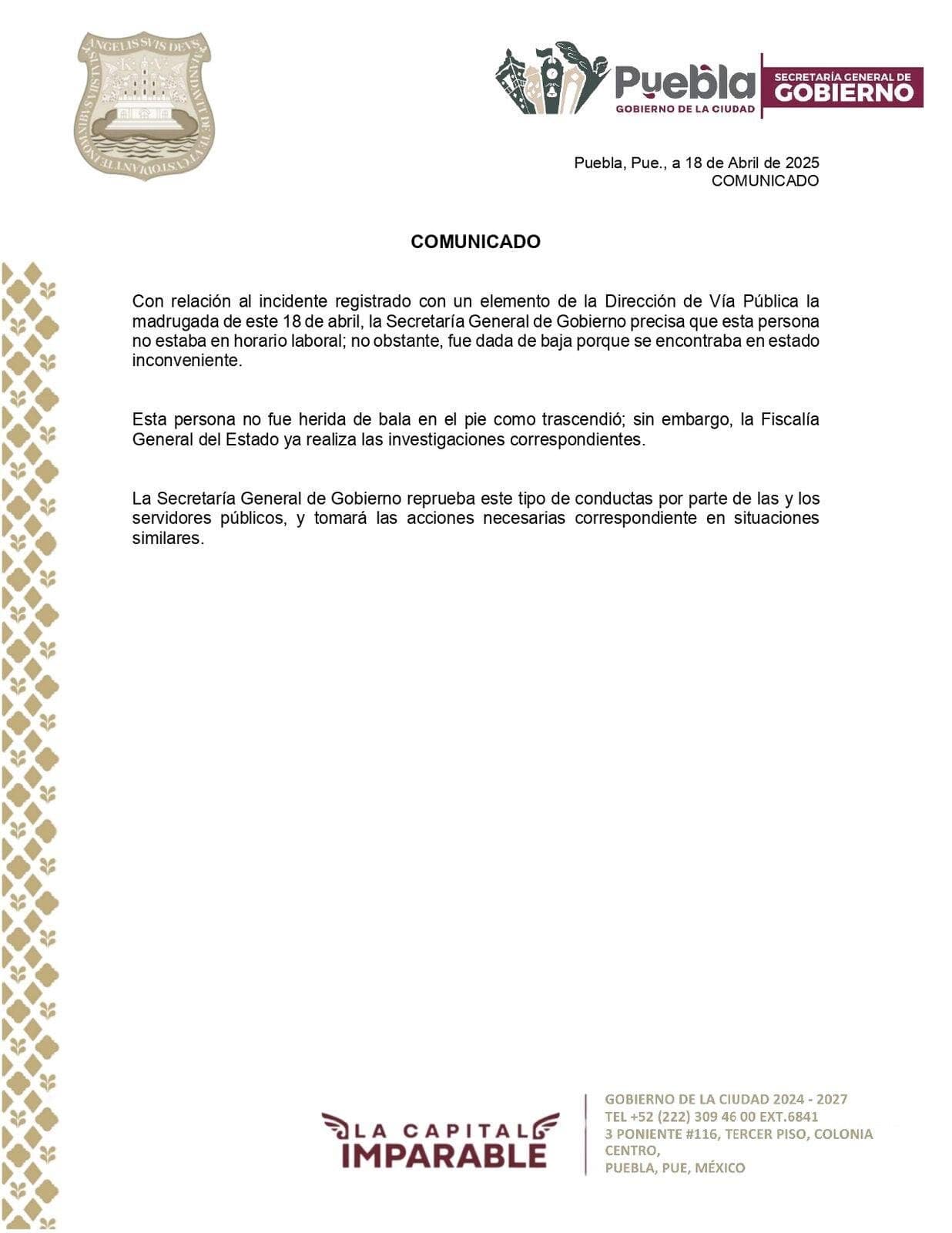 En torno a la información sobre un empleado del Ayuntamiento que habría sido lesionado con arma de fuego, tras salir de un bar, la Secretaría General de Gobierno señaló que no estaba en horario laboral, “no obstante, fue dada de baja porque se encontraba en estado inconveniente”.