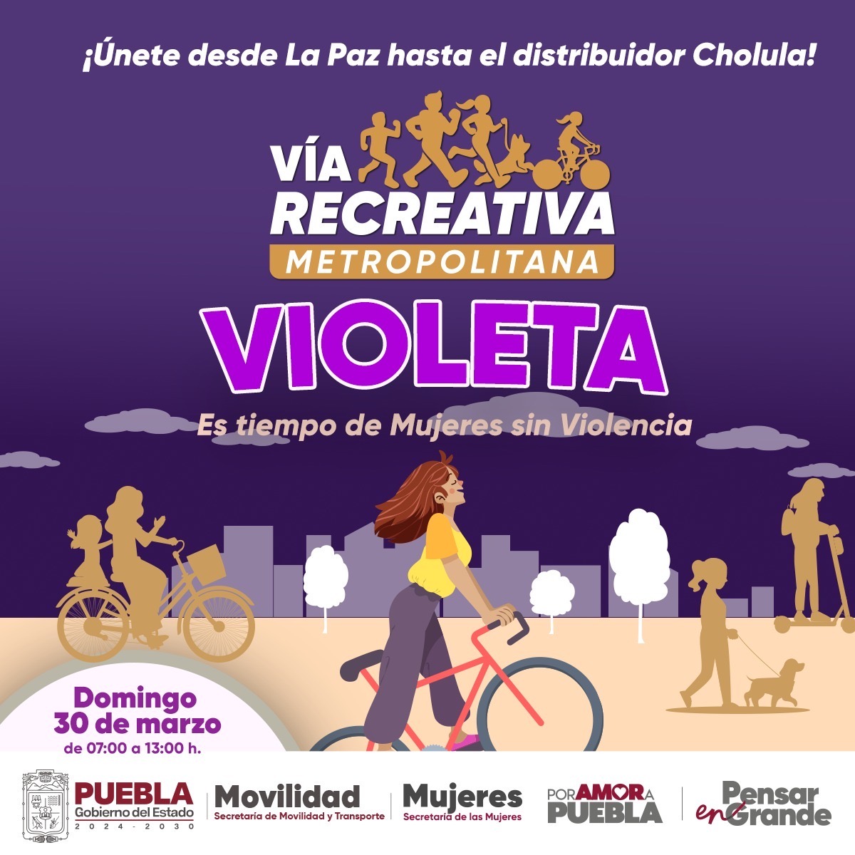 CIUDAD DE PUEBLA, Pue.- Con el firme objetivo de promover espacios públicos incluyentes y libres de violencia, en el marco de las actividades conmemorativas al Día Internacional de la Mujer, el Gobierno del Estado a través de las secretarías de las Mujeres, y de Movilidad y Transporte, llevará a cabo la Vía Recreativa Violeta, este domingo 30 de marzo de 2025, en un horario de 7:00 a 13:00 horas.