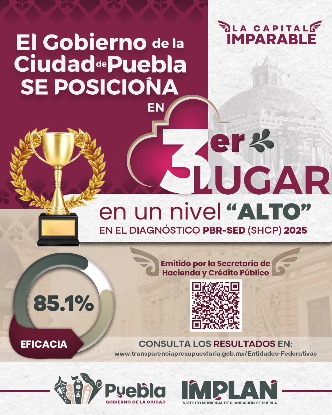 Este diagnóstico evalúa buenas prácticas en áreas estratégicas como la planeación, programación y ejecución del presupuesto, control de recursos, evaluación, transparencia y rendición de cuentas. La capital poblana mejoró su calificación respecto al año anterior, al pasar de 84.6% en 2024 a 85.1% en 2025, representando un gran avance en la calidad de su desempeño.