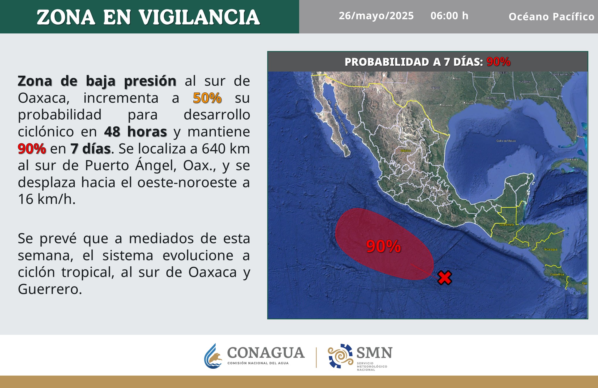 El fenómeno, actualmente una zona de baja presión, se localiza a 640 kilómetros al sur de Puerto Ángel, Oaxaca, y se desplaza hacia el oeste-noroeste a una velocidad de 16 kilómetros por hora. Aunque aún no ha alcanzado la categoría de ciclón, el sistema muestra una organización atmosférica que podría intensificarse en los próximos días.