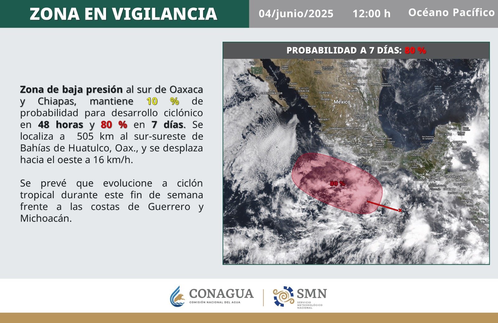 Este nuevo sistema se encuentra a unos 515 kilómetros al sur-sureste de Salina Cruz, Oaxaca, y presenta un 80% de probabilidad de desarrollo ciclónico en los próximos siete días, según el más reciente informe emitido por la Comisión Nacional del Agua (Conagua).