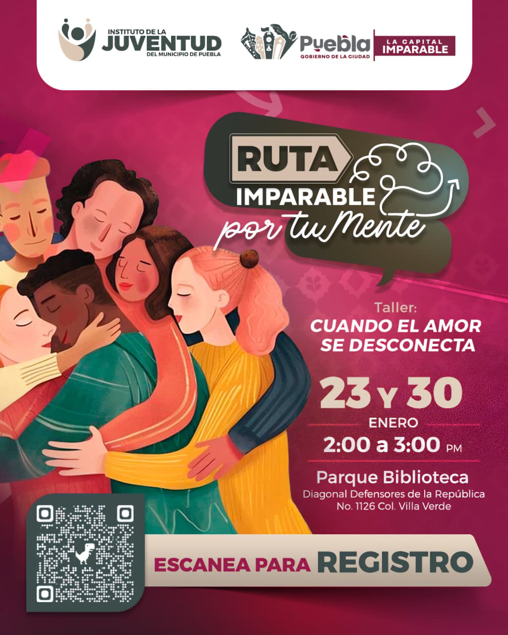 Como parte de las acciones que impulsa el alcalde Pepe Chedraui, desde el Gobierno de la Ciudad, para priorizar la salud mental y el bienestar emocional, el Instituto de la Juventud del Municipio de Puebla (IJMP), encabezado por su titular Carolina Cabrera Victoria, invita a las juventudes a participar en las dos primeras ediciones del taller “Cuando el amor se desconecta”, que se llevará a cabo los días 23 y 30 de enero, en un horario de 2:00 a 3:00 p.m., en el marco de la estrategia Ruta Imparable por tu Mente.